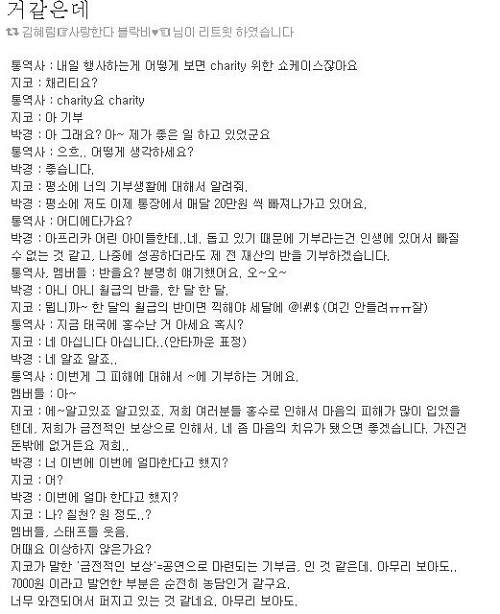 So, as you can see, they may have appeared insensitive to the situation, but it wasn’t nearly as bad as the original internet articles made it out to be. Zico never said he would only donate 7 won. He just said he only had 7 won in his pocket at that moment in answer to Kyung. Zico looked serious about it, whether Kyung was trying to make a joke or not. I think Zico meant he wanted to help Thailand even though he didn’t have much money for himself. You also get the feeling the interpreter was kind of joking along with them, as she laughs a lot too, which says something about the vibe of the place where they were being interviewed.