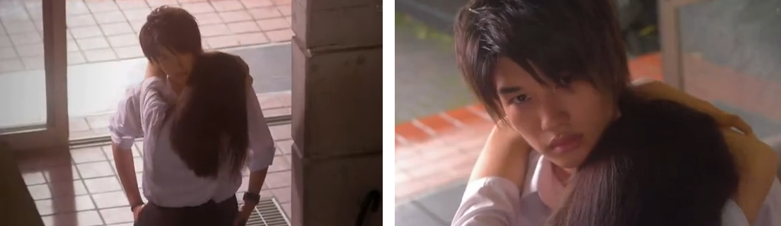 In the next scene, she’s walking down the same hall as before and stops to look down at the locker area where she saw that couple making out earlier. As she’s stopped there in the hall, a boy walks by, then stops. He addresses himself as Souhei and she braces herself for a confession.