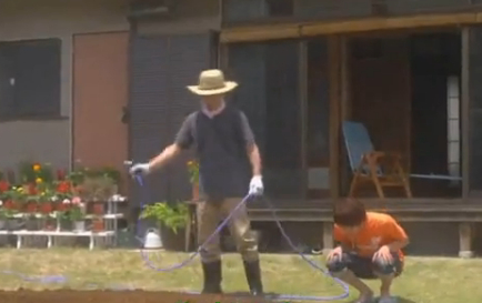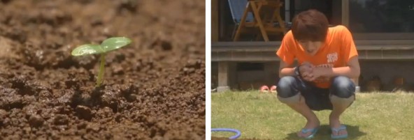 Souhei comes out and sees that some of the plants have just sprouted.