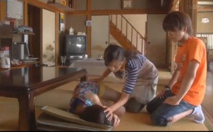 Souhei lays her down in the living room and her mother comes in to take care of her.