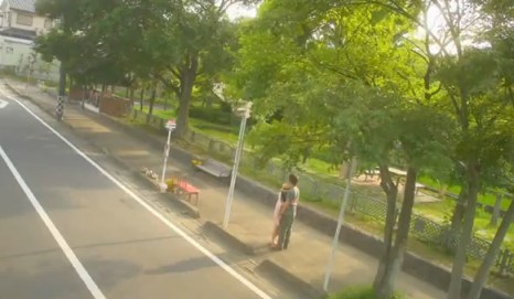 Alone, by the drinking fountain, he remembers the moment between him and Miku when she was sick and he picked her up.