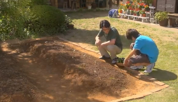 While Kou helps Miku’s dad weed the garden, Hayato and Miku talk on the porch.