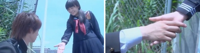 They hide from the teacher and then Miku stands up and takes his hand, (hoho, just like Miku’s “fated one” did to her), and then they run together.