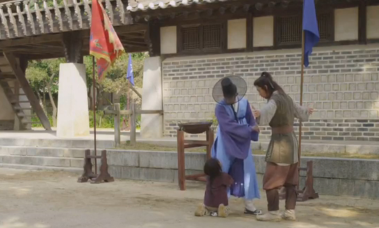 Suddenly the door opens and the kid runs over and hugs Lord Choi’s legs, begging for his father to be released.