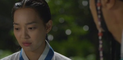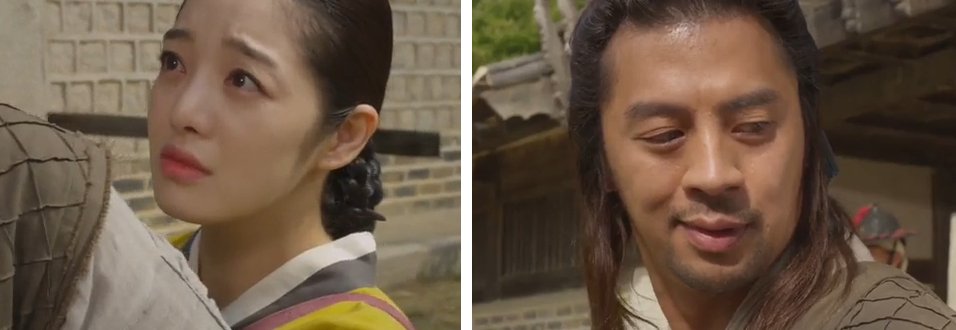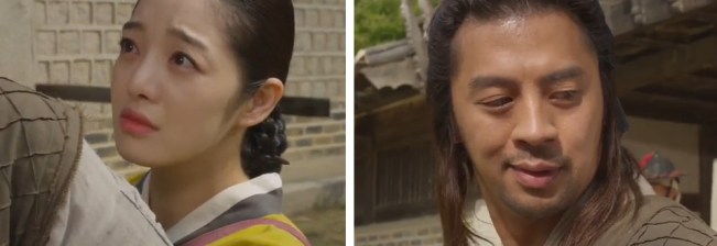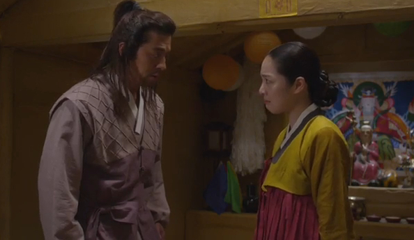 He hands her a package of meat and shyly says that’s all he could do. The shaman looks touched, but then angry, (probably thinking he’s 2-timing her with Arang). She asks him why he’s doing this to her and he looks confused.