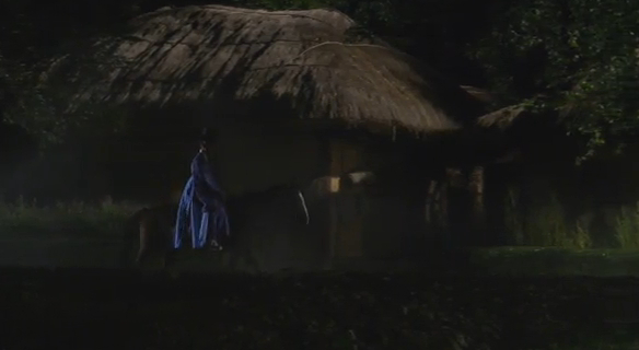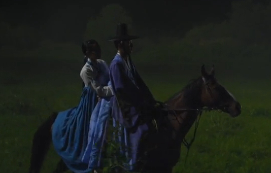 Arang and Eun-oh are riding the horse quickly home.