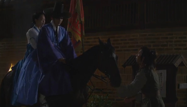 He pulls her up on the horse and Arang says goodbye to Joo-wal. Joo-wal smiles.