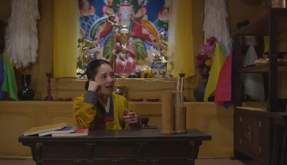 The shaman gets her book and sees Eun-oh walk by. She recognizes him, but doesn’t believe he was the one who could see Arang as a ghost before.