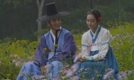 After a bit, they sit together. Arang has a flower in her hair and Eun-oh laughs about it.