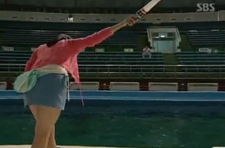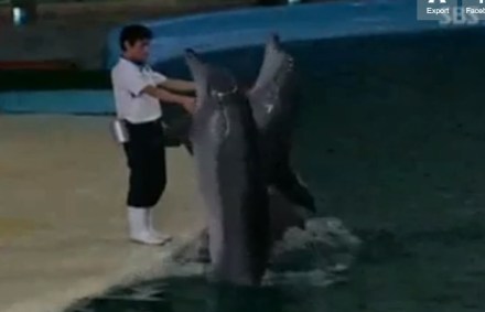 Sora pretends she’s training dolphins on the stage while Tae-pong sits on the sits and cheers.