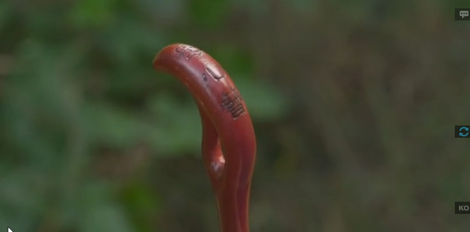 He takes out his fan when he reaches the talisman on the pole and sees it’s shaking like before.