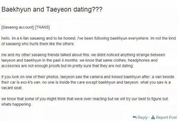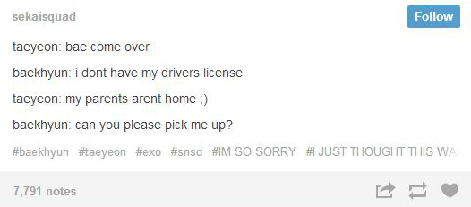 The majority of fan jokes are about the maturity difference between the couple (Baekhyun is a couple years younger, his image in EXO is on the childish side, and Taeyeon is considered his senior in the industry by a significant amount), and the fact that Baekhyun wasn’t the one driving in the leaked photos.(For reference, this is Kkaepsong. It’s a famous EXO catchphrase that refers to disappointment of the heart).